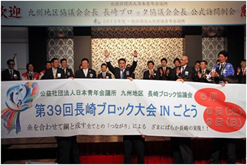 九州地区協議会岡田会長(宮崎JC)をはじめとする九州地区役員による事業説明と、長崎ブロック岩下会長による本年度の運営方針と想いが語られ、懇親会の場においては本年度、私たち福江青年会議所が主管する「第39回長崎ブロック大会INごとう」のキャラバンを行わせて頂きました。
