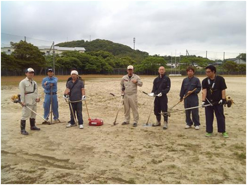 グラウンドの外周は30センチほどに伸びた雑草がべったり生えていたので、なかなか根気がいりましたが、五島市商工会富江支部の方々からご協力いただきなんとかお客様をお迎えできる状態になりました。一緒に汗をかいた皆様、本当にご苦労さまでした。